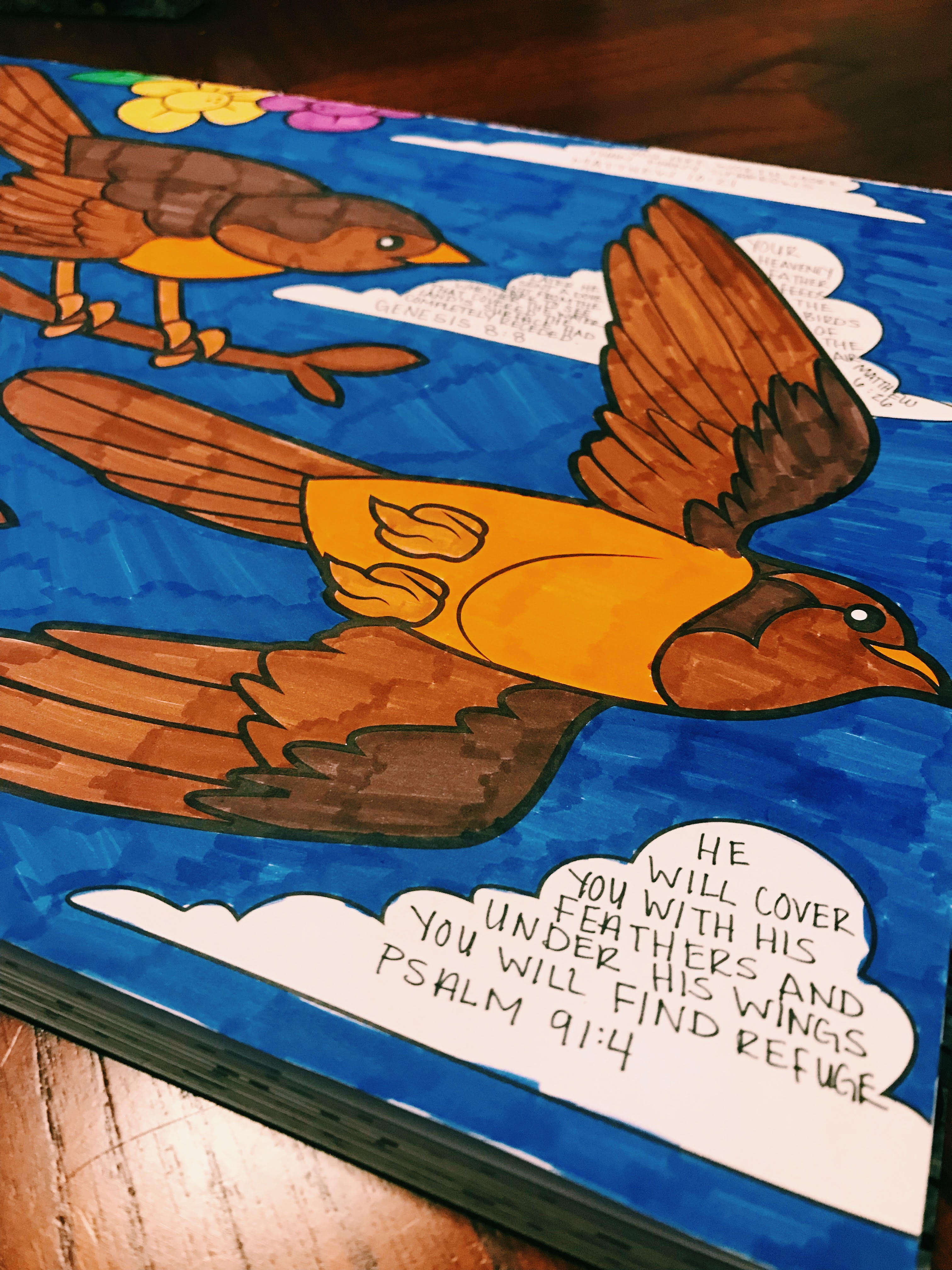 I went to Ross for a coloring book and there sat an animal jumbo coloring book. I was thinking I needed a scripture one, but as soon as I saw it, I questioned it because it seemed shallow, but then I thought, “These are the creatures of the living God, I will color these.” God loves me more than the animals of the world, yet it is obvious that He even cares for the animals by the way He designed them. They have no instruction, yet know what to do. That is God.